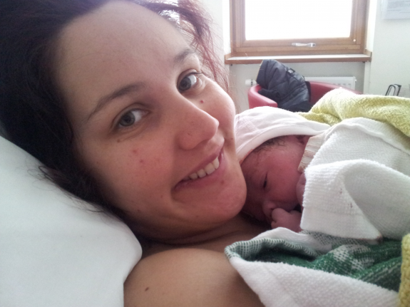 Tog en dusch, men kände att jag behövde gå på toa. Som sagt, förstagångsföderska som jag var förstod jag först inte att det var värkarna som hade börjat. Nu hade klockan hunnit bli runt 08.00 så jag ringde tillbaka till förlossningen och sa att jag kommer när det börjar bli dags.